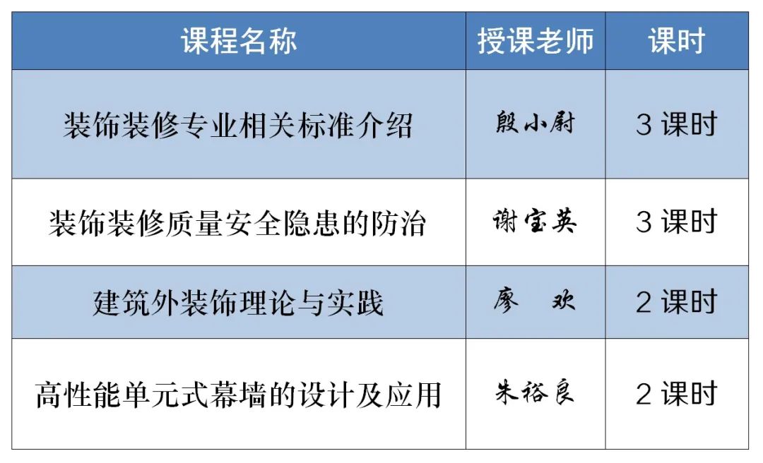 《装饰装修专业相关标准介绍》课程,系统阐述了我国装饰装修行业工程建设标准和国家标准化改革新进展,介绍了新标准的特点与创新点。《装饰装修质量安全隐患的防治》课程,从技术规范标准、深化设计、施工工艺、质量通病防治以及施工组织策划等多个维度总结先进做法,分享经验。《建筑外装饰理论与实践》课程,介绍了建筑幕墙常用材料的性能、规范要求以及新材料等,通过项目案例深入浅出地讲述幕墙知识,提升学员对幕墙全方位认识。《高性能单元式幕墙的设计及应用》课程,重点介绍了幕墙热工性能的三个方面,分析了幕墙的隔声影响因子,介绍了防撞击性能和光学性能,分享了建筑幕墙与建筑亮化结合的常见形式,展示了智能幕墙和生态绿植幕墙案例。