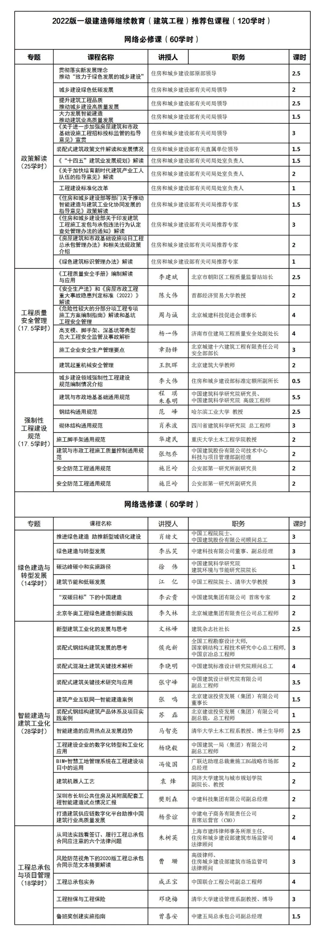 为方便大家学习,我们还精心推出了2022版一级注册建造师(建筑工程专业)继续教育(推荐包)120学时网络课程。其中,必修课网络课程包括政策解读、工程质量安全管理、强制性工程建设规范(新设专题)等4个专题,共计27门课程60学时;选修课网络课程包括绿色建造与转型发展、智能建造与建筑工业化、工程总承包与项目管理等3个专题,共计24门课程60学时。2022版推荐包网络课程比去年推荐包网络课程更新26门课程共计58学时,更新率达48.3%!