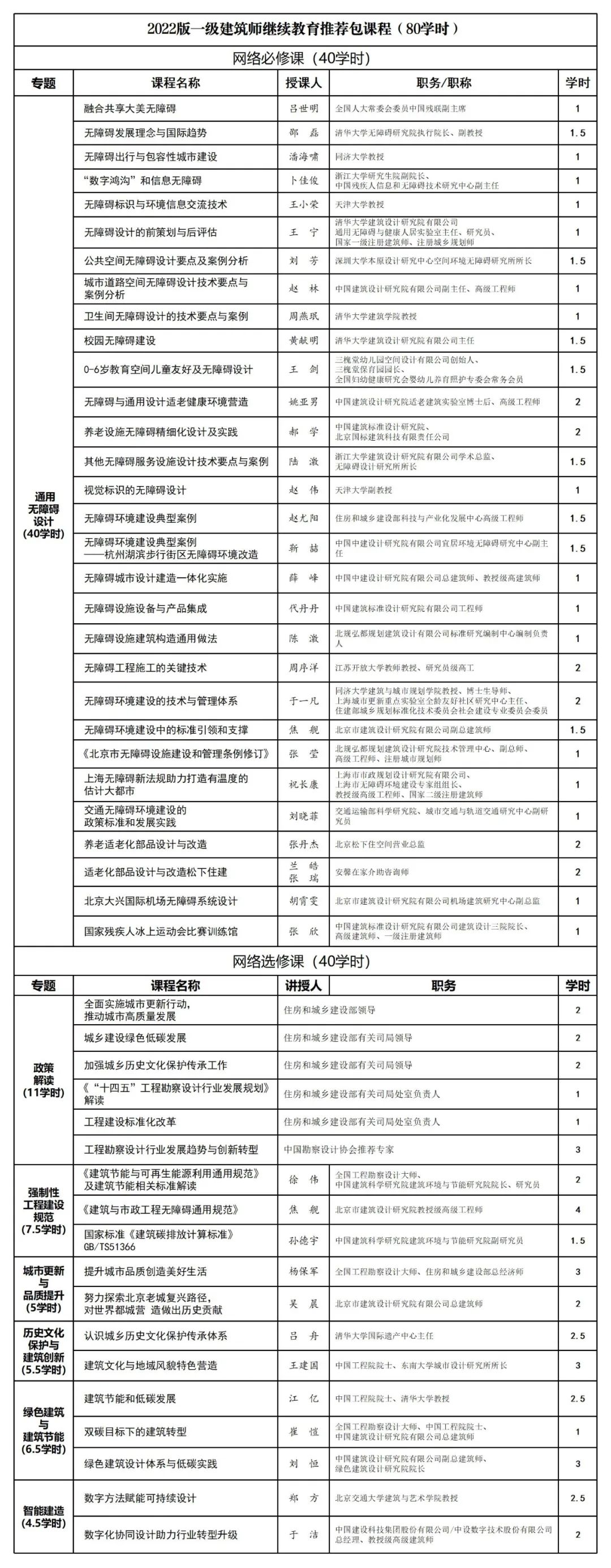 2022版注册建筑师继续教育必修课网络课程根据全国注册建筑师管理委员会秘书处《全国注册建筑师继续教育必修教材(之十三)教学计划》要求,以《通用无障碍设计》为教材,课程内容包括通用无障碍导论、无障碍环境设计、无障碍工程建设、“十四五”期间的无障碍立法与政策、无障碍环境建设典型案例等5个方面,共30门课程40学时。该版必修课网络课程对2021版网络课程全部更新,更新率达100%。